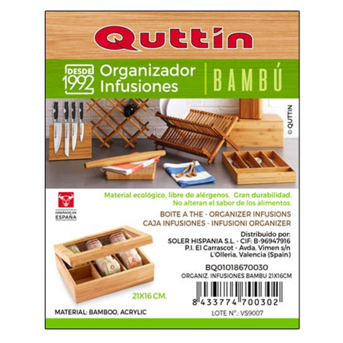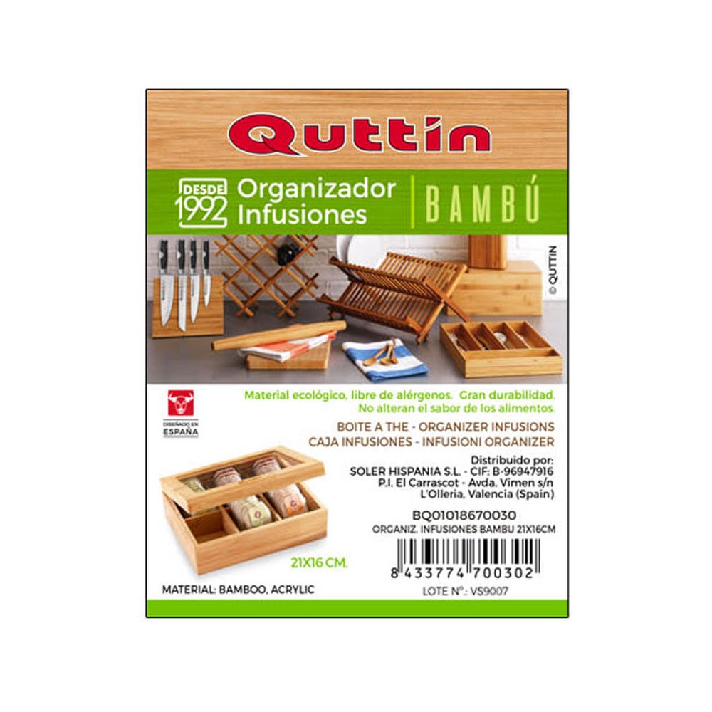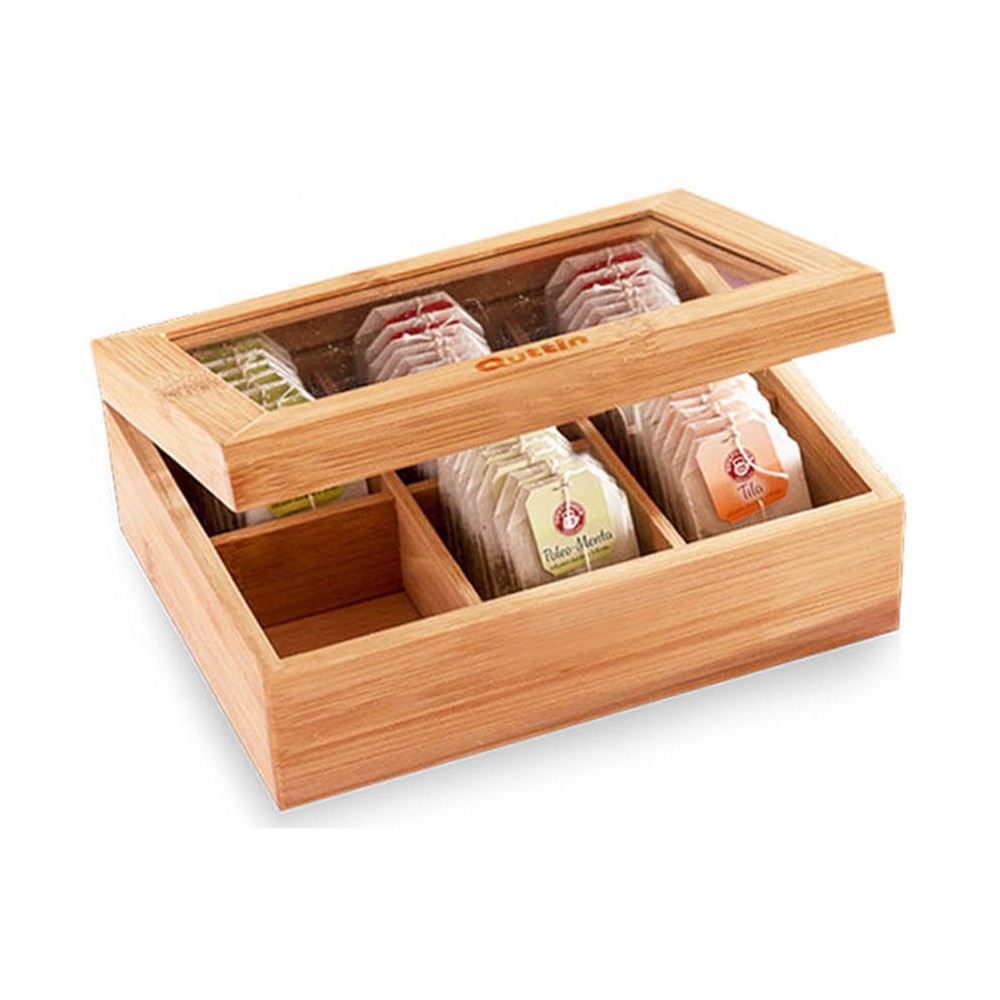 Caja de té realizada en madera de bambú con divisiones interiores, tiene seis compartimentos para guardar, conservar y clasificar los distintos tipos de tés, perfecta para las bolsas de té. La caja lleva la tapa con ventana de cristal para ver el contenido sin necesidad de abrirla, su diseño sencillo es fácilmente combinable con otros accesorios de cocina.