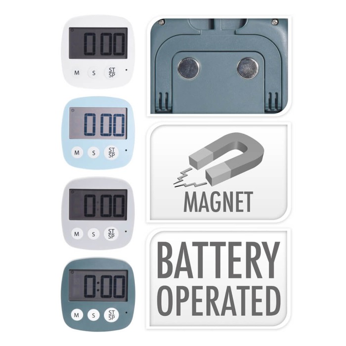 Temporizador de cocina digital fabricado en plástico de color blanco, azul claro, gris o azul con pantalla LCD de fácil lectura. Un accesorio de cocina super práctico para controlar con exactitud los tiempos de cocción de las recetas. Hasta 99,59 minutos. Lleva imán para que puedas fijarlo en superficies metálicas.