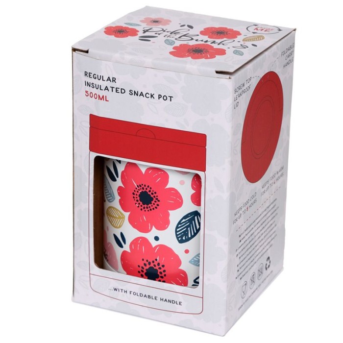 Este termo para alimentos tiene un bonito diseño floral con amapolas rojas y rosas sobre fondo claro. Su formato compacto es ideal para transportarlo cómodamente, además, dispone de un asa plegable y tapa de rosca a pruebe de fugas para que no tengas que preocuparte de posibles escapes.