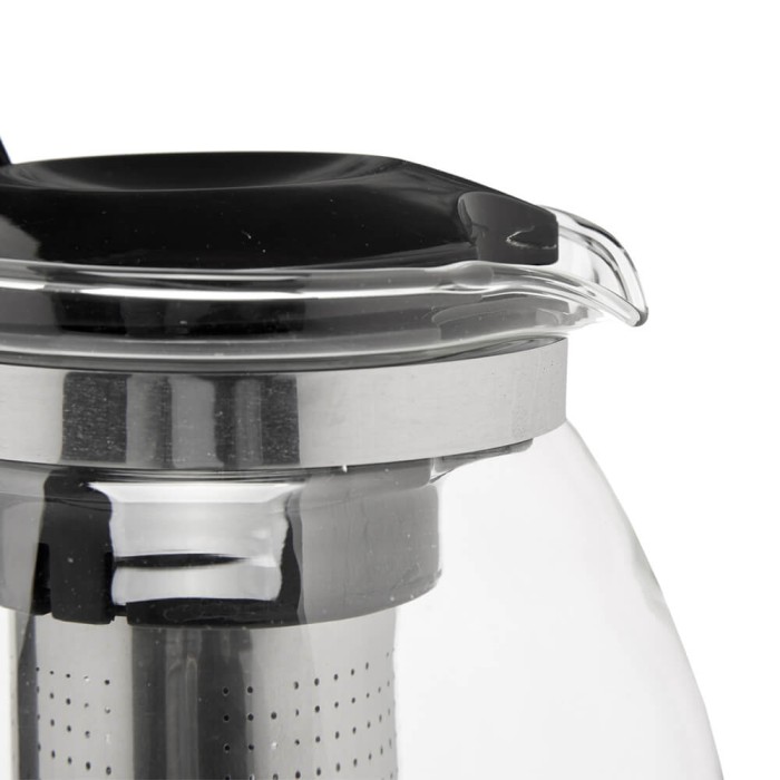 Jarra tetera de cristal de 1,5L con filtro metálico, asa y tapa de plástico negro. Ideal para preparar infusiones y bebidas frías. Medidas: 14 x 20 x 16 cm.