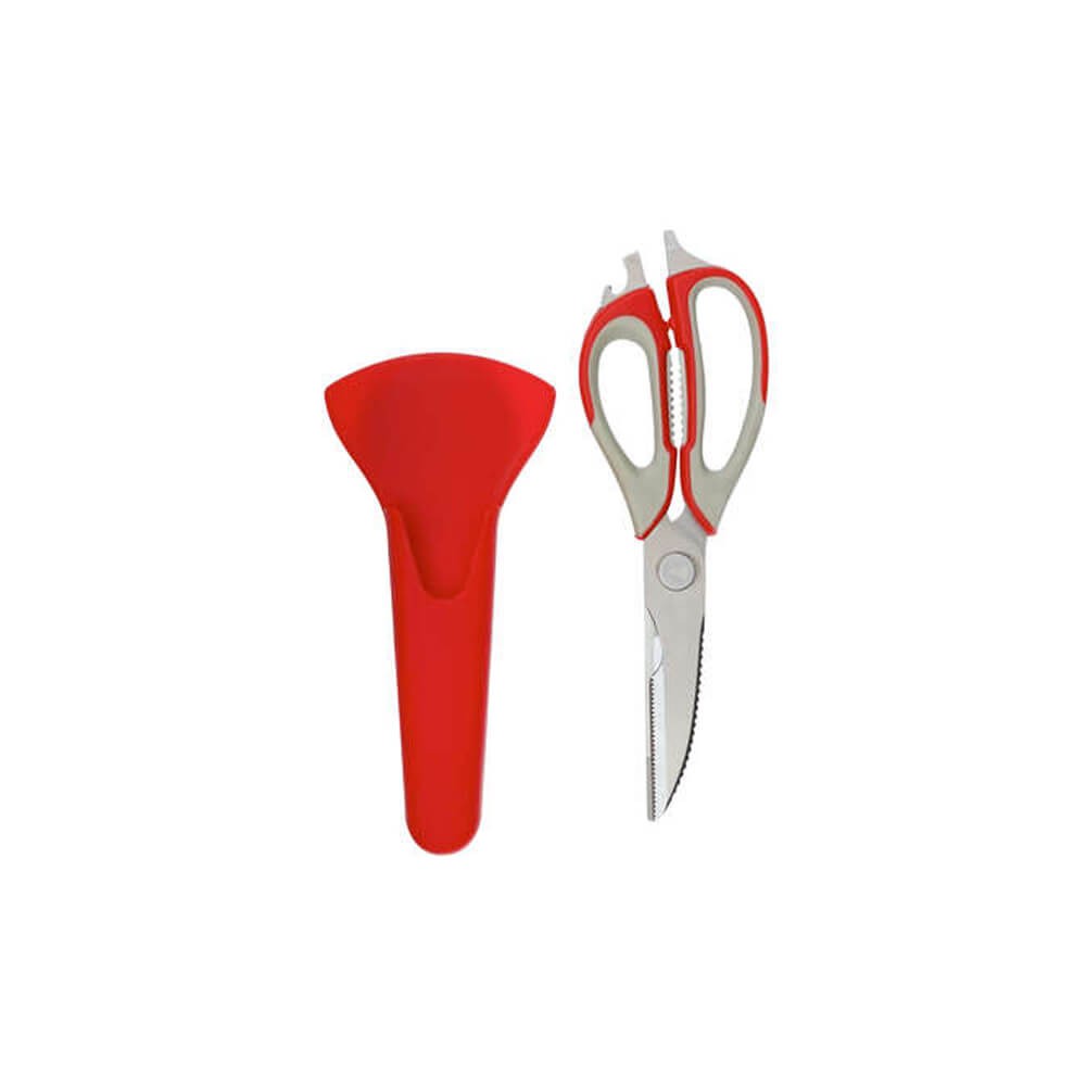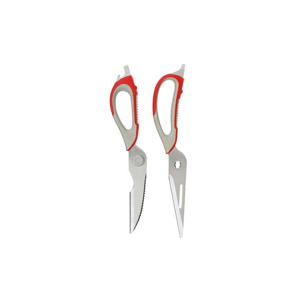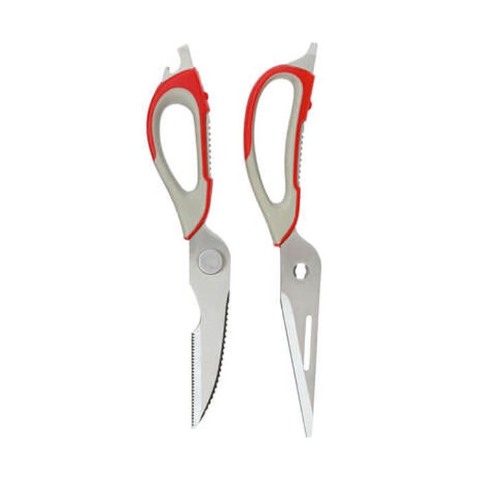 Práctica tijera multiusos realizada en acero inoxidable con mango de polipropileno con cascanueces y abrebotellas integrado, un imprescindible en tu cocina para facilitar tu día a día.