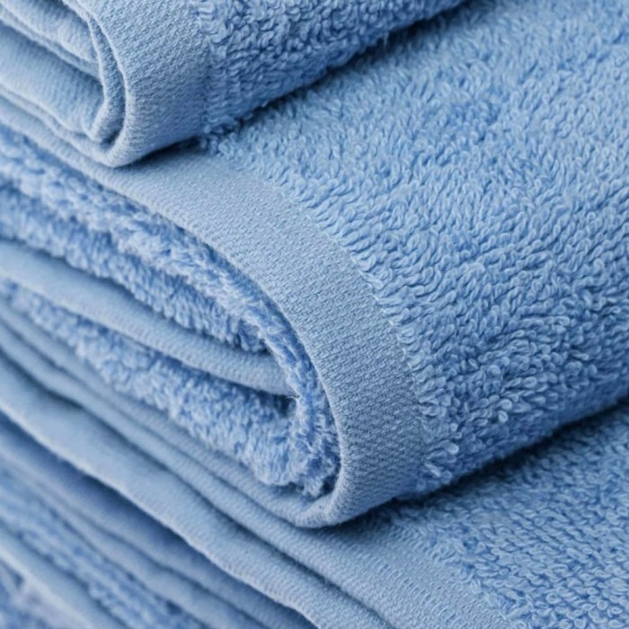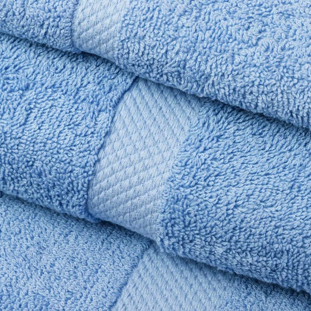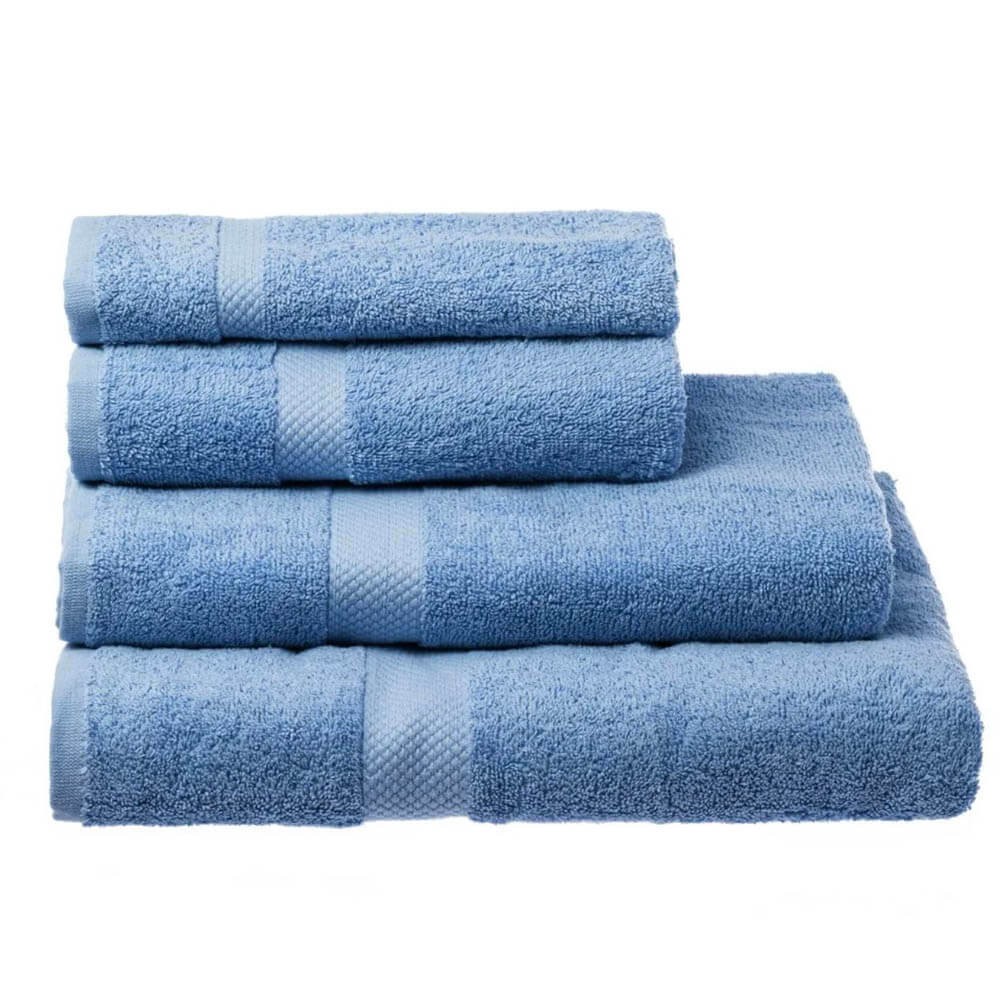 Toalla de baño tamaño tocador en color azul, confeccionada 100% en algodón peinado de alta calidad de 550gr. El tejido sorprende por su suavidad y absorción, por lo que será una delicia envolverse en la toalla después de un baño o de una ducha.