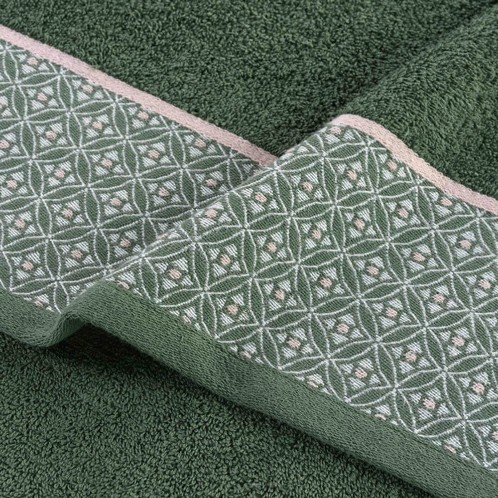 Toalla de baño de rizo diseño Belina de 450grs/m², gruesa y esponjosa, confeccionada en algodón peinado 100% de color verde con cenefa bordada con dibujos geométricos.