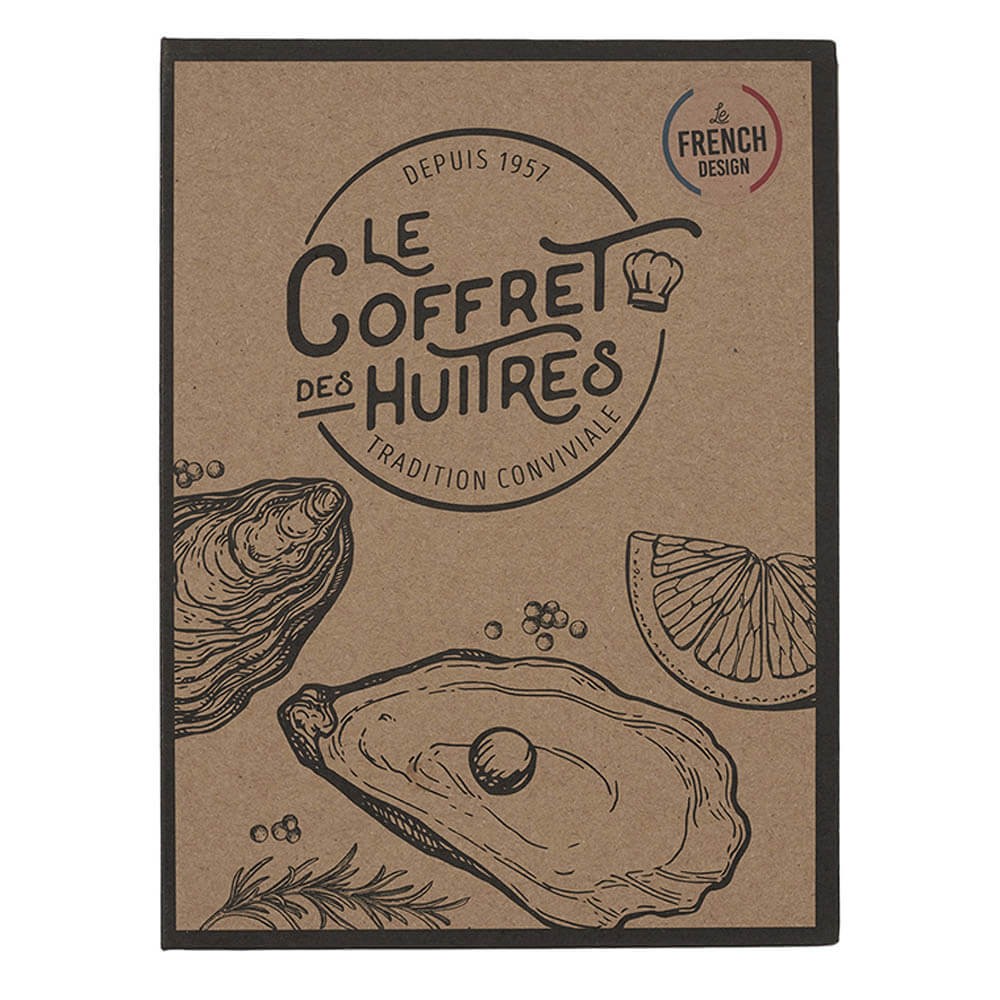 Kit para ostras presentado en una original caja de cartón kraft decorada, ideal para regalo. El set incluye 1 cuchillo para abrir ostras con mango de madera y 5 tenedores.