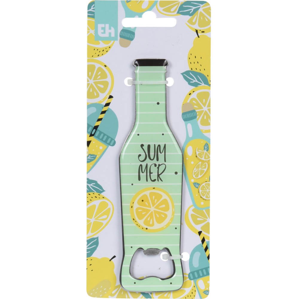 El abrebotellas tiene un diseño alegre y veraniego de limones en tonos verdes y amarillos. Su funcionamiento manual es super sencillo, tan solo hay que insertar la pestaña en la base de la chapa y realizar palanca con el mango para retirar la chapa.