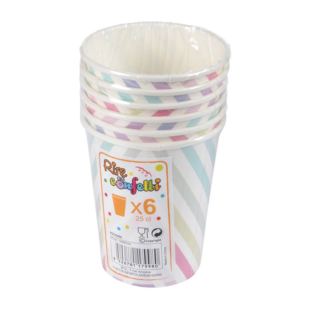 6 Vasos de cartón diseño arcoíris con 25CL de capacidad.
