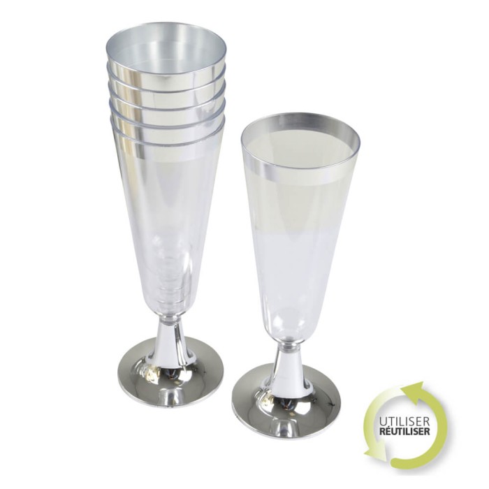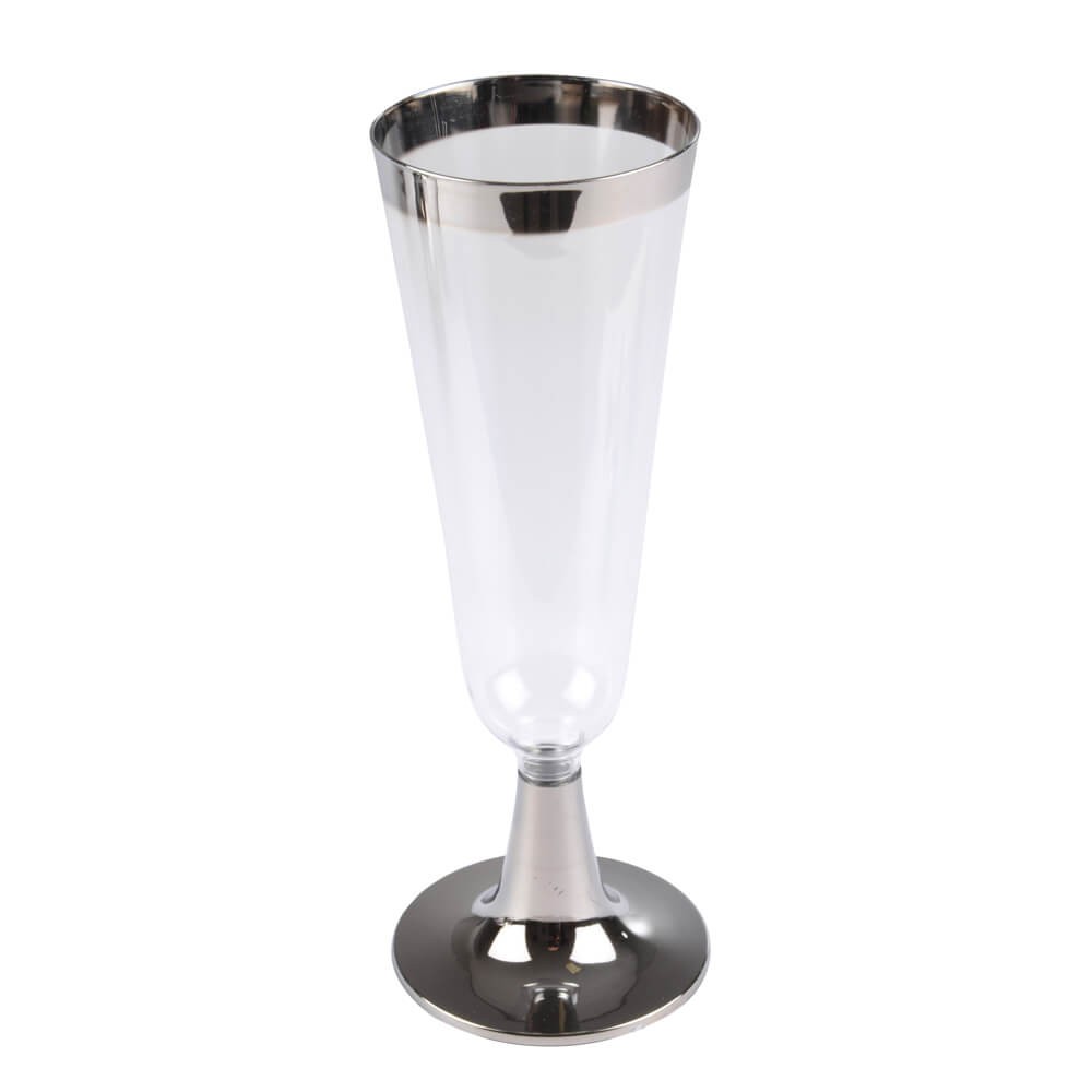 Pack con 6 copas de plástico transparente con pie y filo de color plata, la forma de flauta es idónea para servir champan. Estas copas de cava reutilizables con un acabado efecto cristal son perfectas para fiestas y eventos.