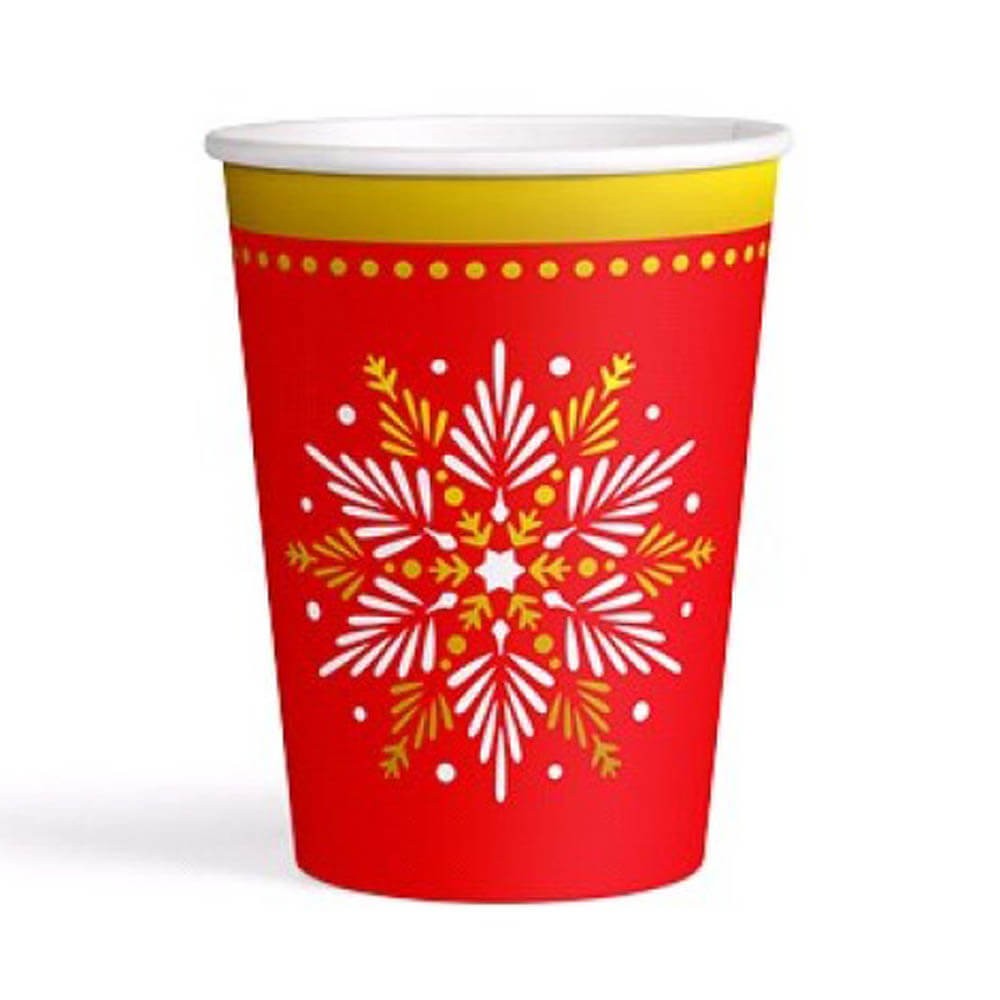 Vasos de cartón decorados con 270ml de capacidad diseño navideño, fabricados en cartón resistente con una bonita impresión de un copo de nieve sobre fondo rojo, perfectos para fiestas de Navidad. Cada paquete contiene 6 vasos decorados.