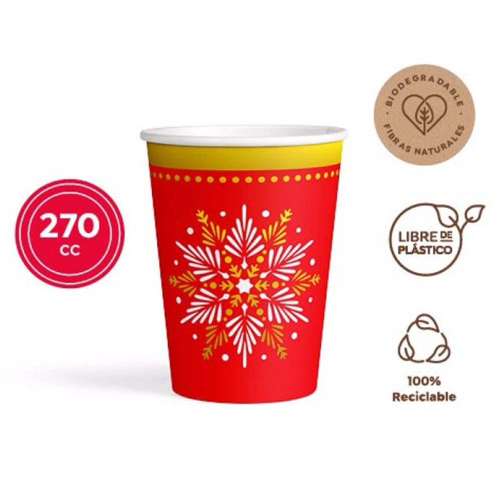 6 Vasos de cartón biodegradable diseño copo en color rojo, perfectos para celebraciones navideñas.