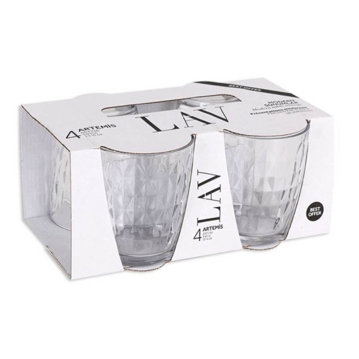 4 Vasos de agua modelo Artemis realizados en cristal transparente de gran calidad con 340CC de capacidad. Los vasos tienen un maravilloso diseño de diamante de estilo Art déco. Fabricados en Turquía por la cristalería LAV.