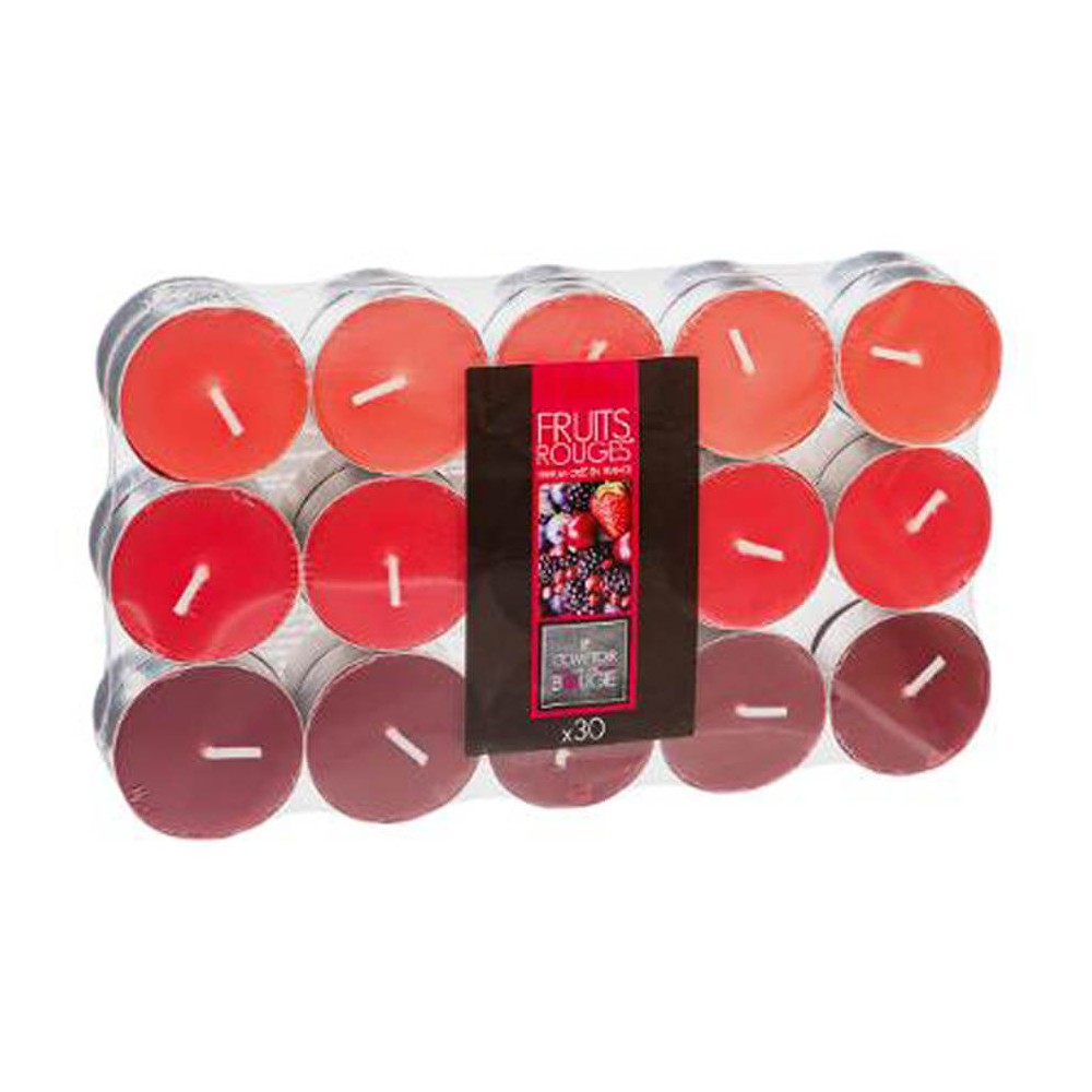 24 Velas de té con aroma a frutos del bosque, vainilla, coco o jazmín.