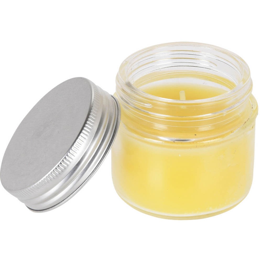 Vela de citronela en tarro de cristal transparente con tapa de rosca metálica, ideal para ahuyentar mosquitos.