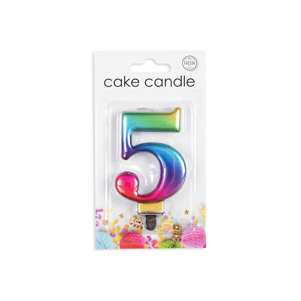 Vela de cumpleaños en color arcoíris con forma de número "5", lleva una práctica lengua de plástico en la parte inferior para garantizar una sujeción perfecta a la tarta.