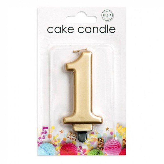 Vela de cumpleaños en color oro con forma de número "1", lleva una práctica lengua de plástico en la parte inferior para garantizar una sujeción perfecta a la tarta.