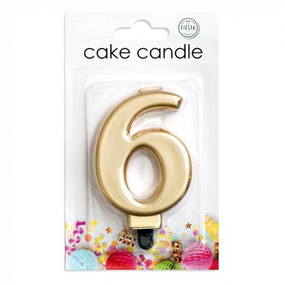 Vela de cumpleaños en color oro con forma de número "6", lleva una práctica lengua de plástico en la parte inferior para garantizar una sujeción perfecta a la tarta.