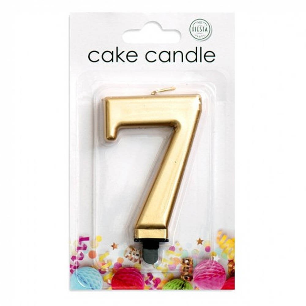 Vela de cumpleaños en color oro con forma de número "7", lleva una práctica lengua de plástico en la parte inferior para garantizar una sujeción perfecta a la tarta.