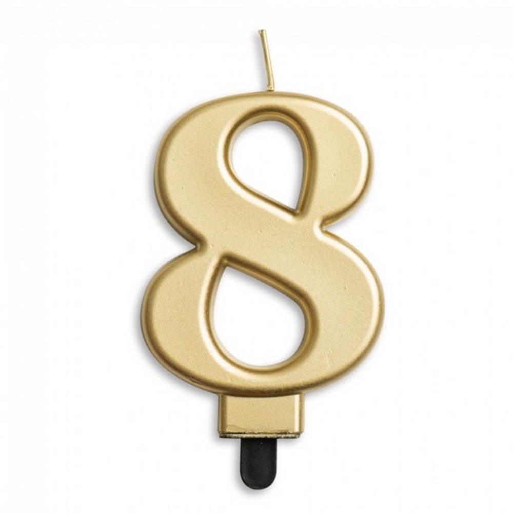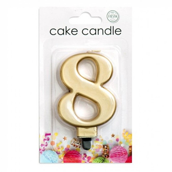 Vela de cumpleaños en color oro con forma de número "8", lleva una práctica lengua de plástico en la parte inferior para garantizar una sujeción perfecta a la tarta.
