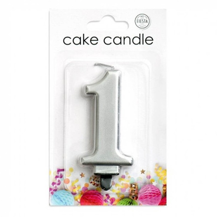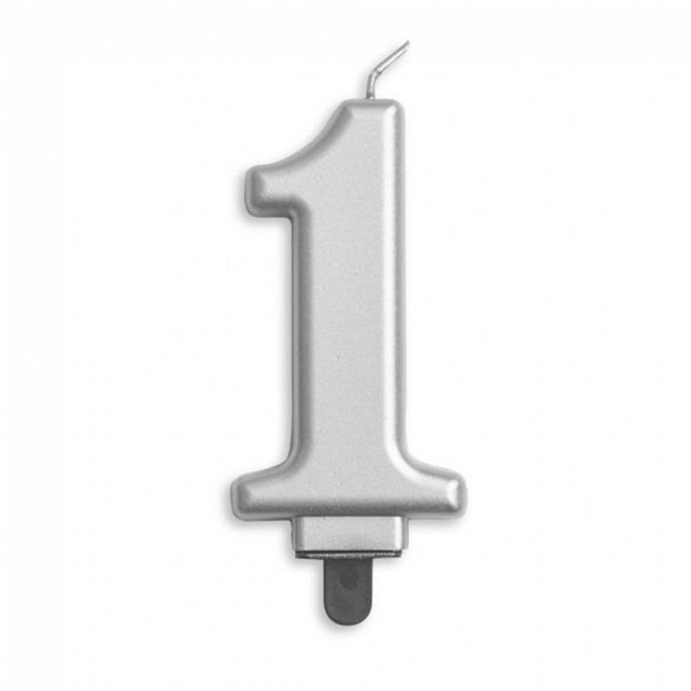 Vela de cumpleaños en color Plata con forma de número "1", lleva una práctica lengua de plástico en la parte inferior para garantizar una sujeción perfecta a la tarta.