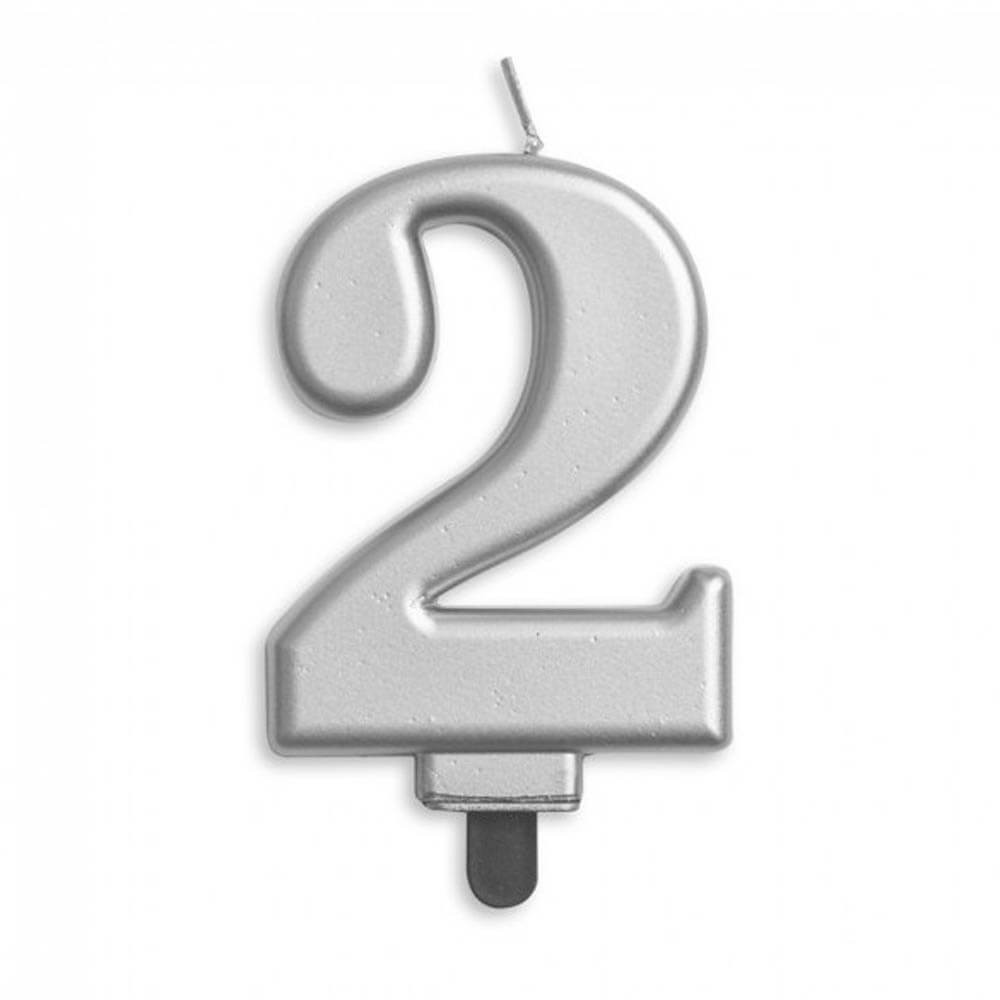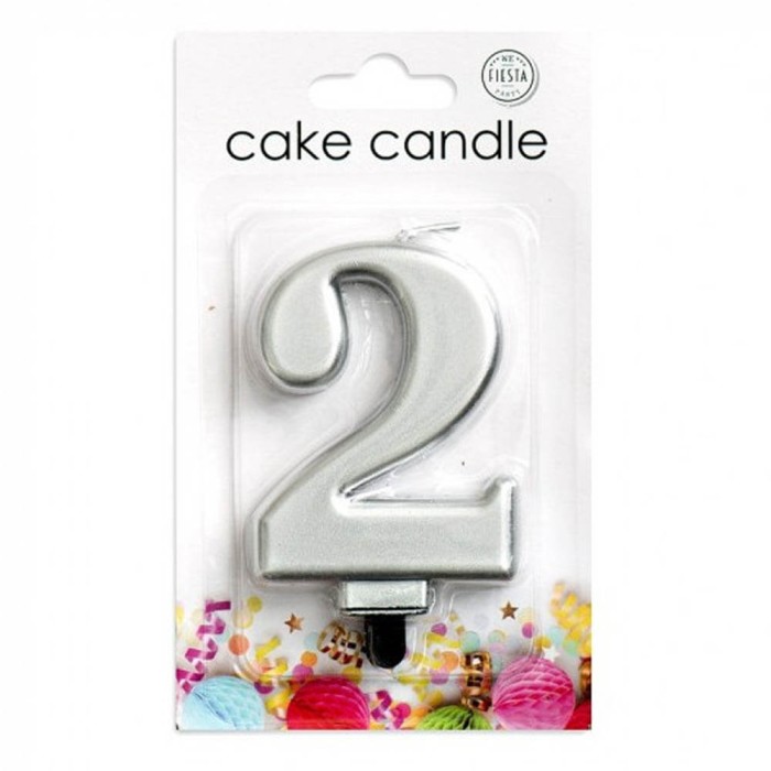 Vela de cumpleaños en color Plata con forma de número "2", lleva una práctica lengua de plástico en la parte inferior para garantizar una sujeción perfecta a la tarta.