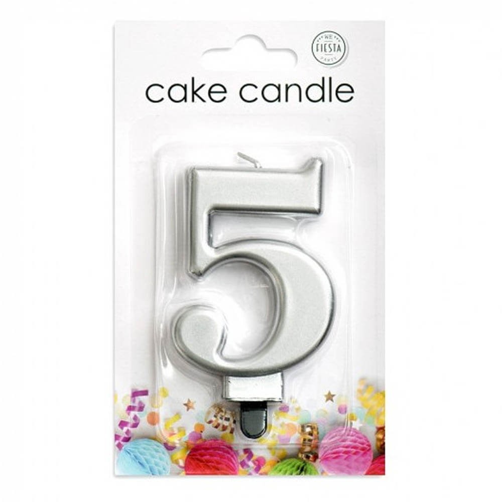 Vela de cumpleaños en color Plata con forma de número "5", lleva una práctica lengua de plástico en la parte inferior para garantizar una sujeción perfecta a la tarta.