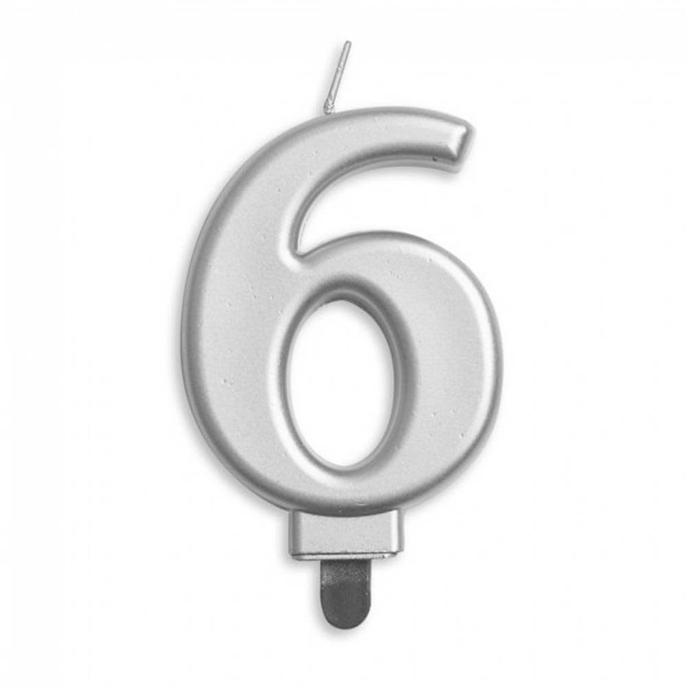 Vela de cumpleaños en color Plata con forma de número "6", lleva una práctica lengua de plástico en la parte inferior para garantizar una sujeción perfecta a la tarta.