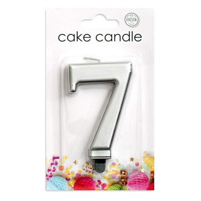 Vela de cumpleaños en color Plata con forma de número "7", lleva una práctica lengua de plástico en la parte inferior para garantizar una sujeción perfecta a la tarta.