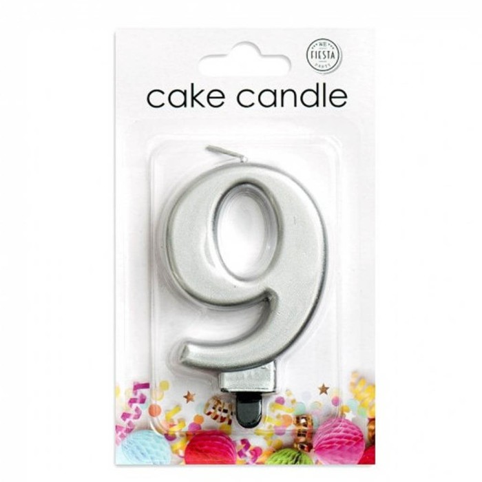 Vela de cumpleaños en color Plata con forma de número "9", lleva una práctica lengua de plástico en la parte inferior para garantizar una sujeción perfecta a la tarta.