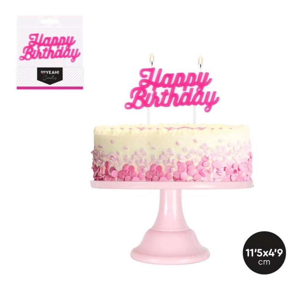 Vela de cumpleaños rosa que forma la palabra Happy Birthday en dos líneas con doble mecha, lleva dos pilares de plástico en la parte inferior para garantizar una sujeción perfecta a la tarta.