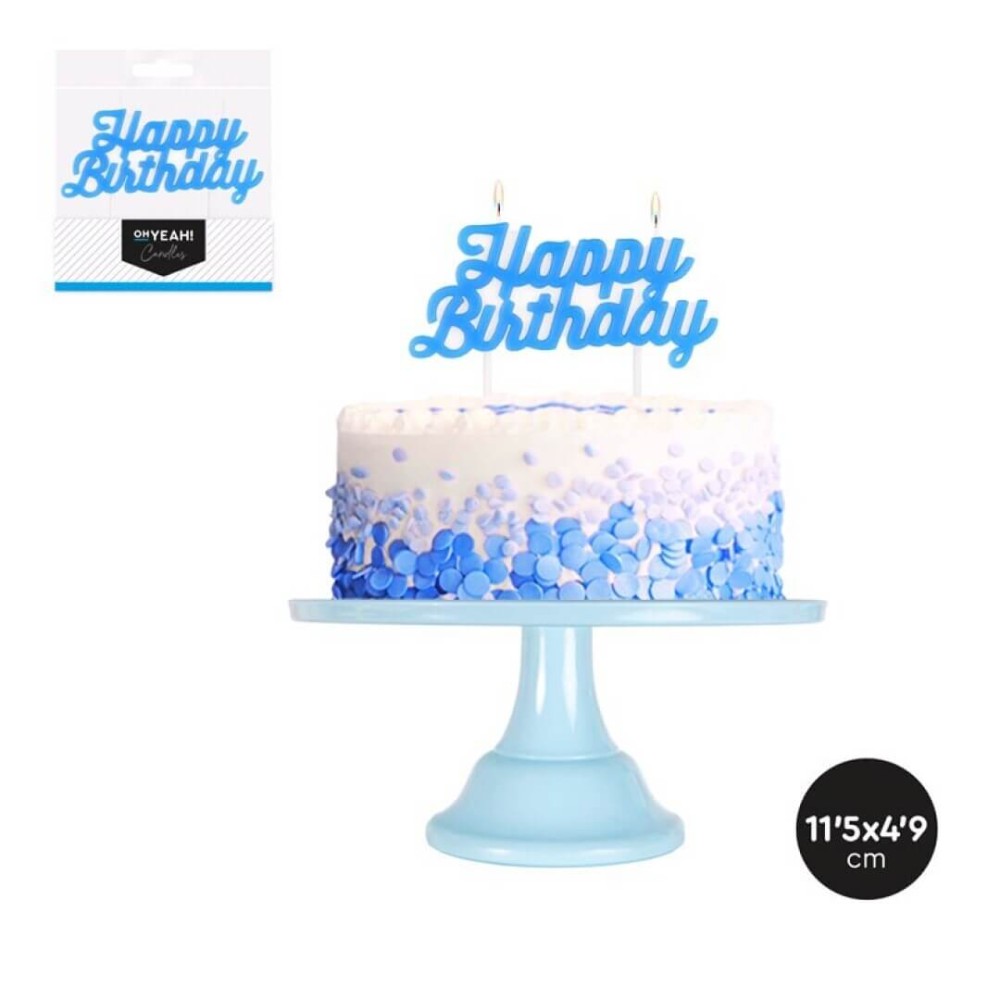 Vela de cumpleaños azul que forma la palabra Happy Birthday en dos líneas con doble mecha, lleva dos pilares de plástico en la parte inferior para garantizar una sujeción perfecta a la tarta.