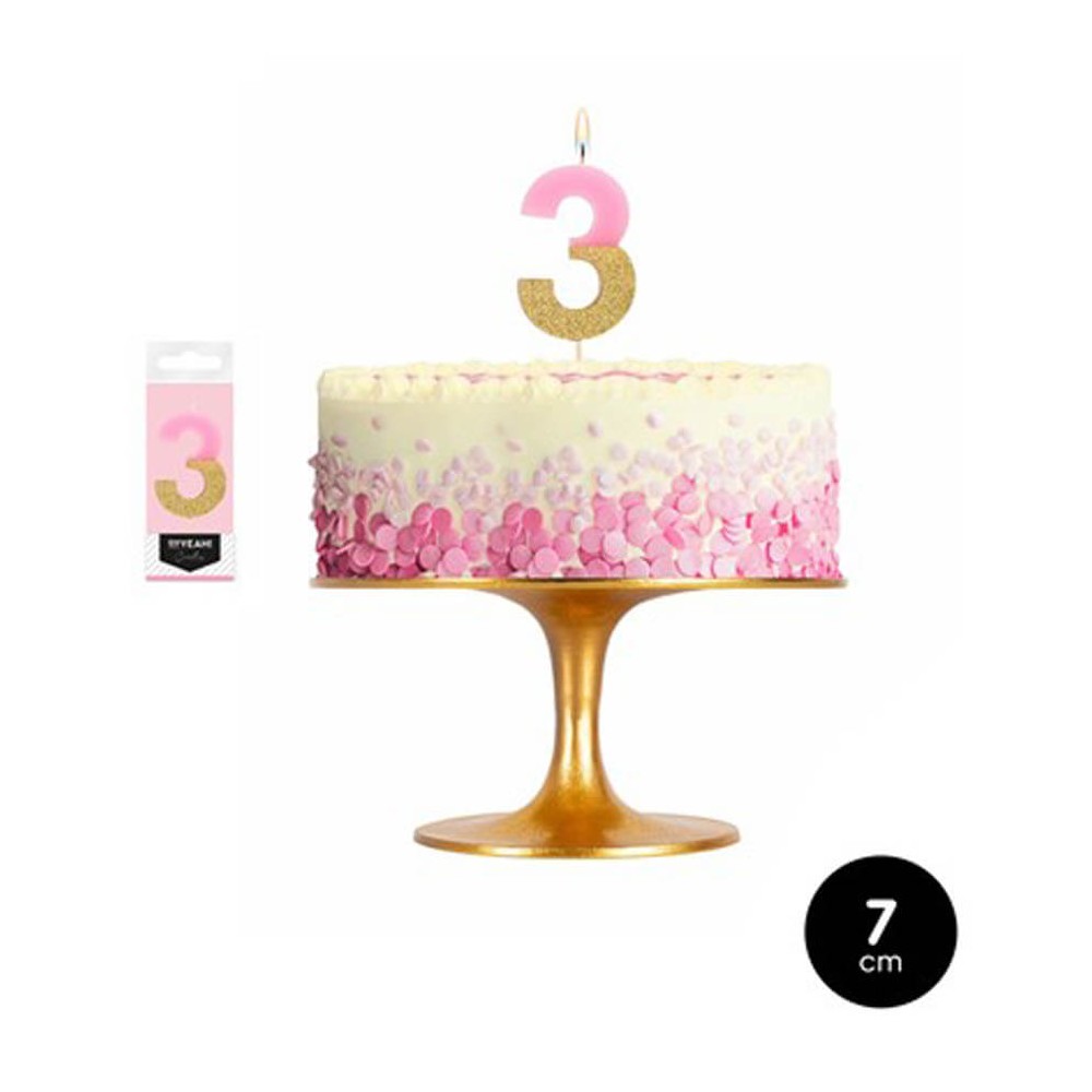Vela de cumpleaños diseño bicolor rosa - glitter dorado en forma de número "3", lleva un práctico pincho de madera en la parte inferior para garantizar una sujeción perfecta a la tarta.