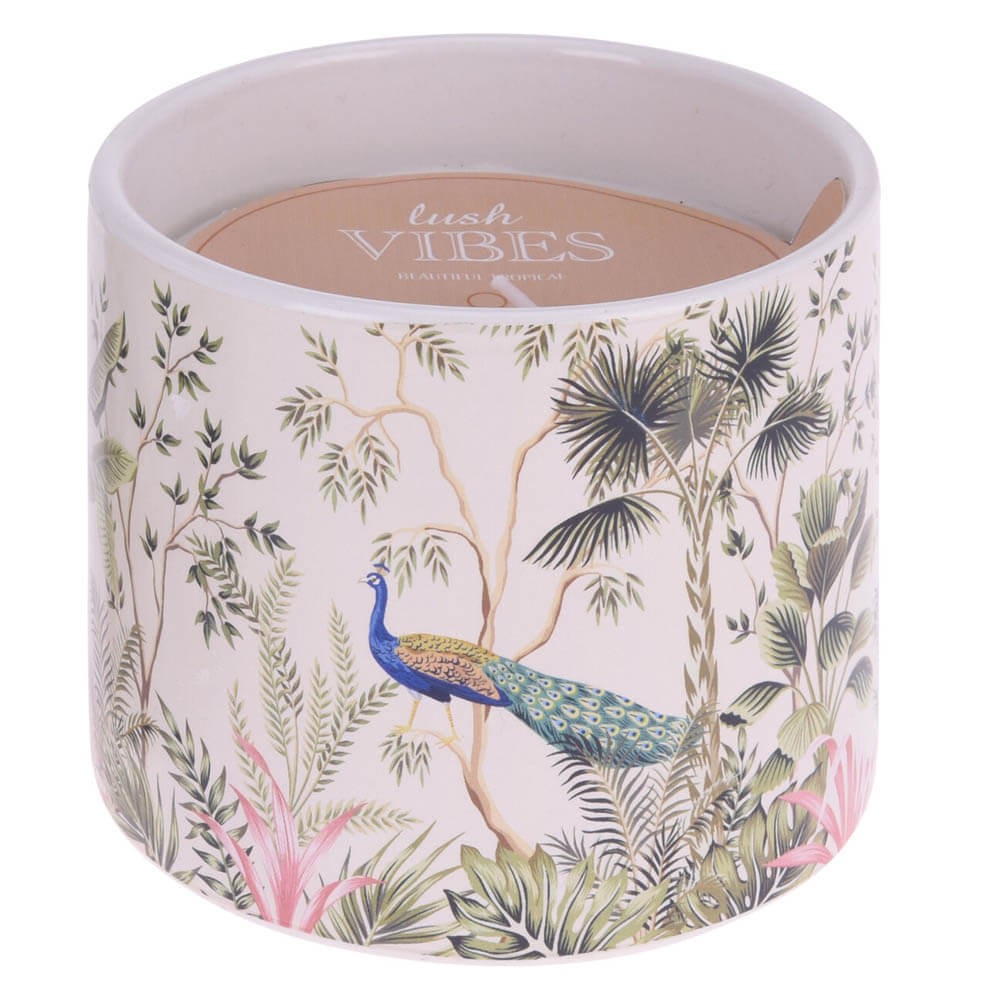 Vela tropical en tarro de cerámica. 2 diseños, Loro o Pavo Real.