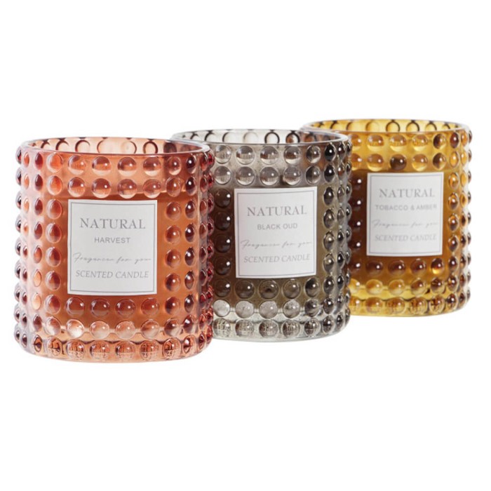 Si buscas una vela perfumada con un diseño elegante y sofisticado, esta vela envasada en un bonito vaso de cristal con puntos en relieve es una excelente opción. Disponible en tres colores con diferente aroma, esta vela añadirá un toque de elegancia y estilo a tu hogar.