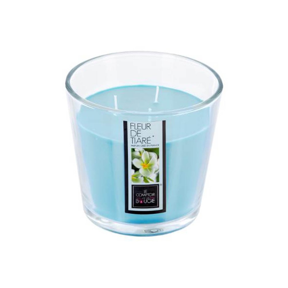 Vela aromática azul en tarro de cristal transparente, perfume Flor de Tiaré.