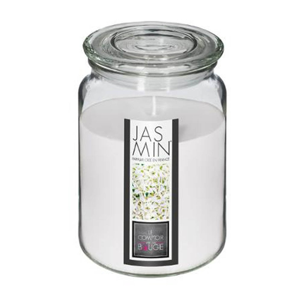 Vela aromática de cera con perfume a Jazmín envasada en frasco de cristal transparente con tapa. Una vela decorativa con un embriagador perfume floral creado en Francia, te trasladara a los días de primavera, perfecta para crear un ambiente acogedor y cálido.