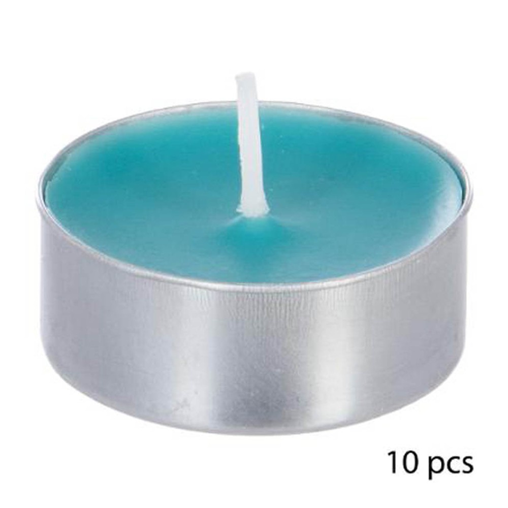 Set de 10 velas tea light en vaso de aluminio realizadas en cera de color azul con perfume a coco, perfectas para perfumar el hogar creando un ambiente exótico y acogedor.
