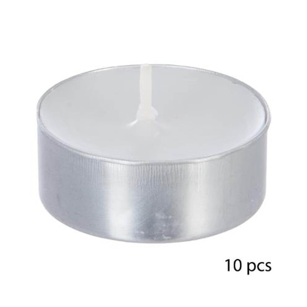 Set de 10 velas tea light en vaso de aluminio realizadas en cera de color blanco con perfume a vainilla, sus fragancia embriagadora es perfecta para perfumar el hogar creando un ambiente sensual y acogedor.