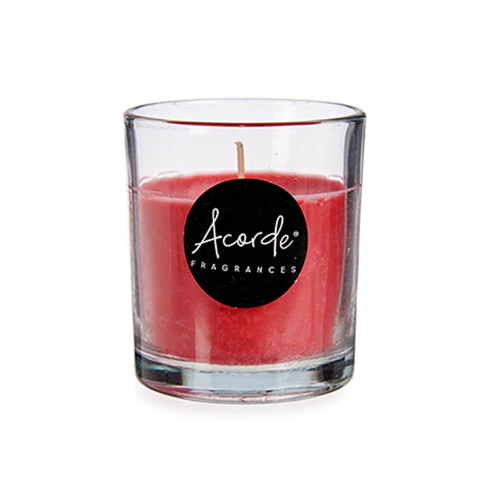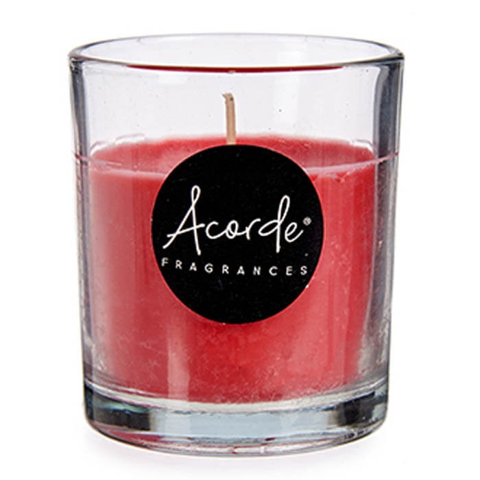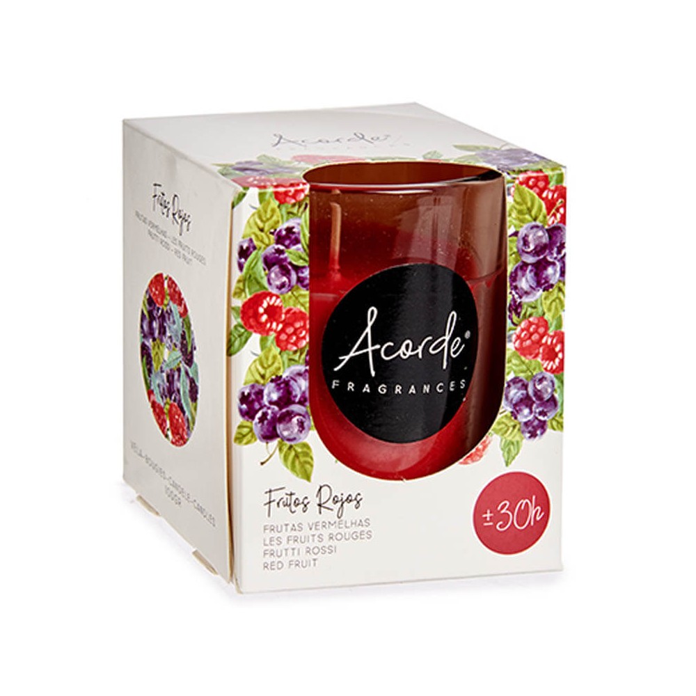 Vela aromática roja con perfume a frutos rojos en vaso de cristal.