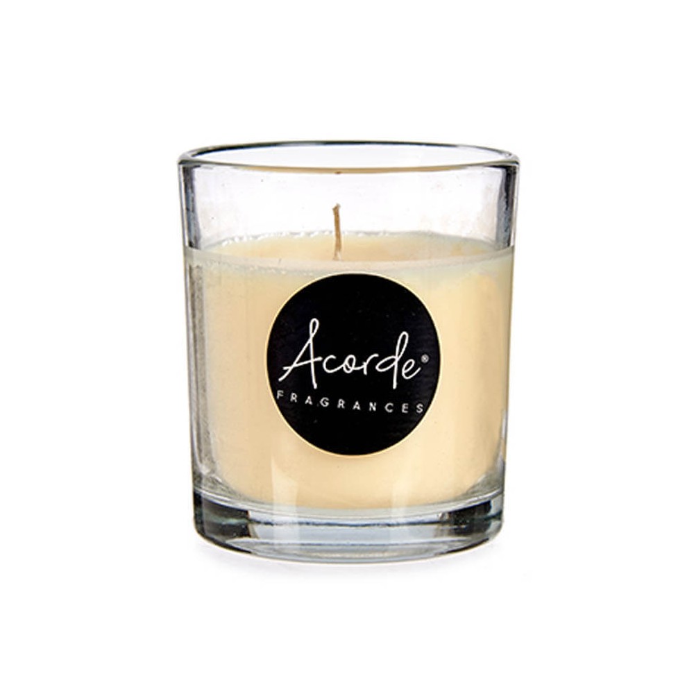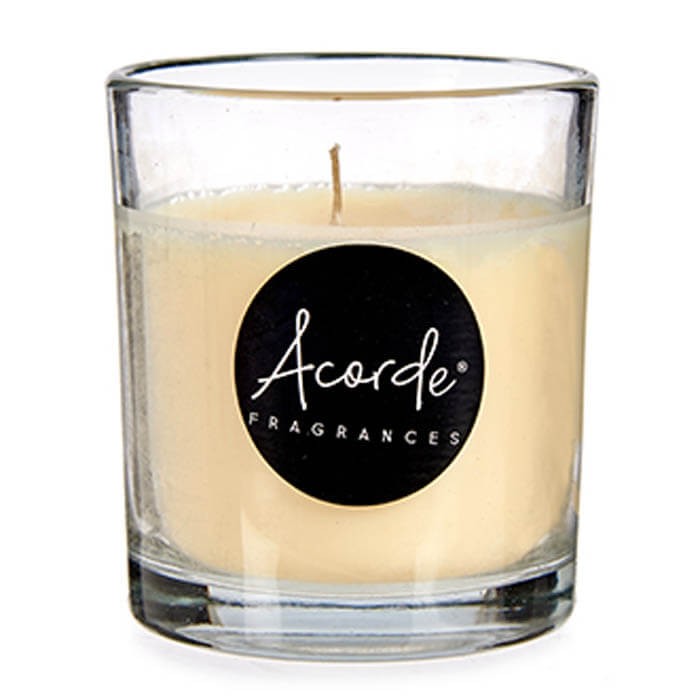 Vela aromática con perfume a vainilla en vaso de cristal transparente.
