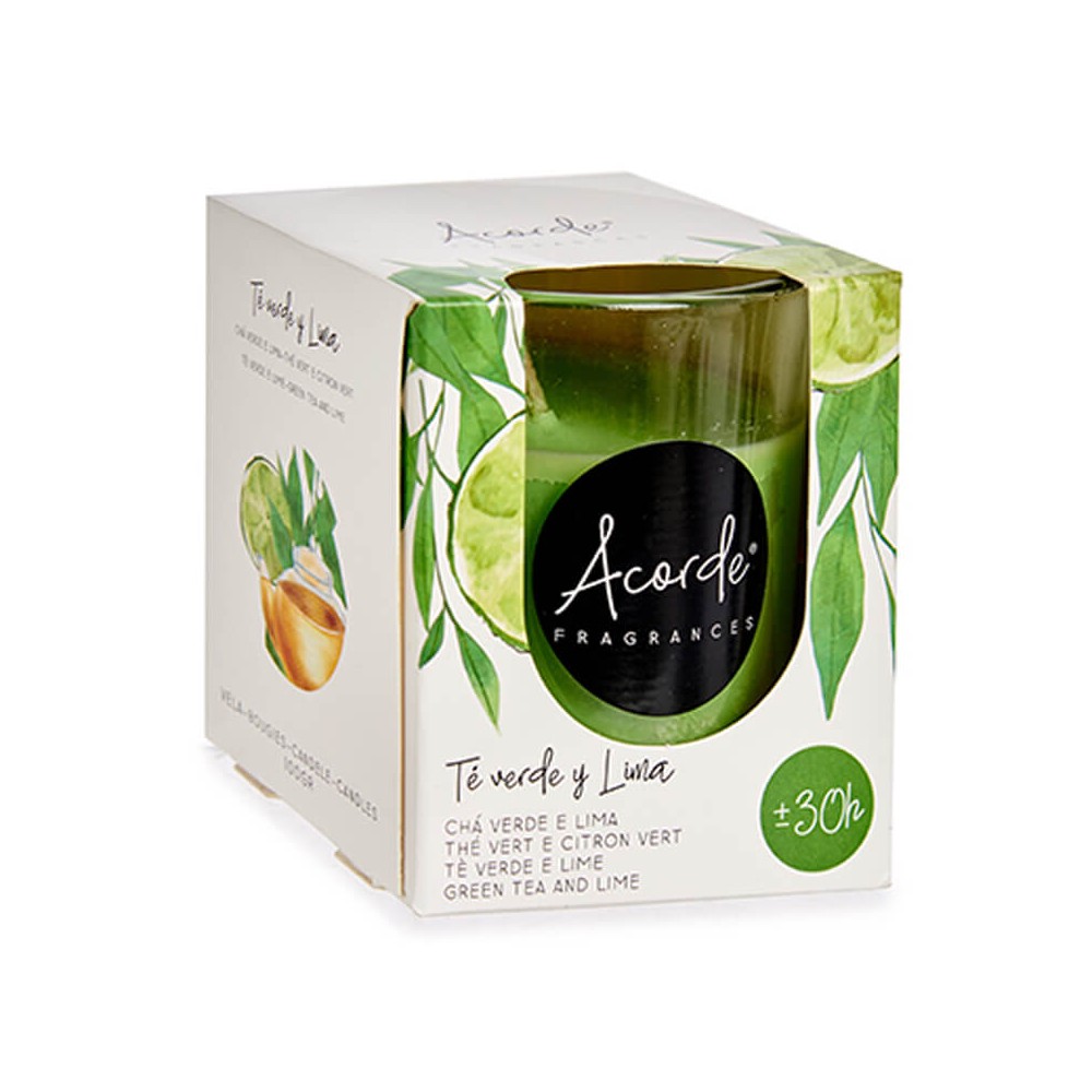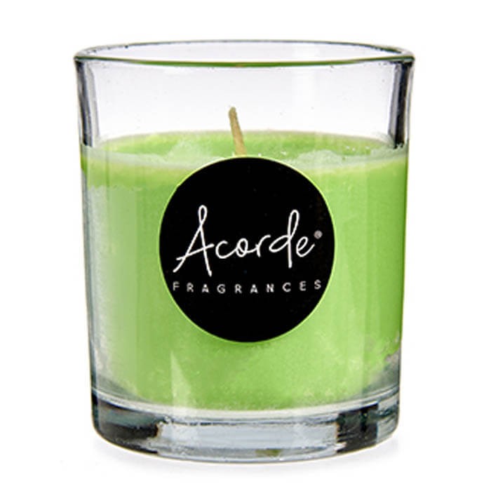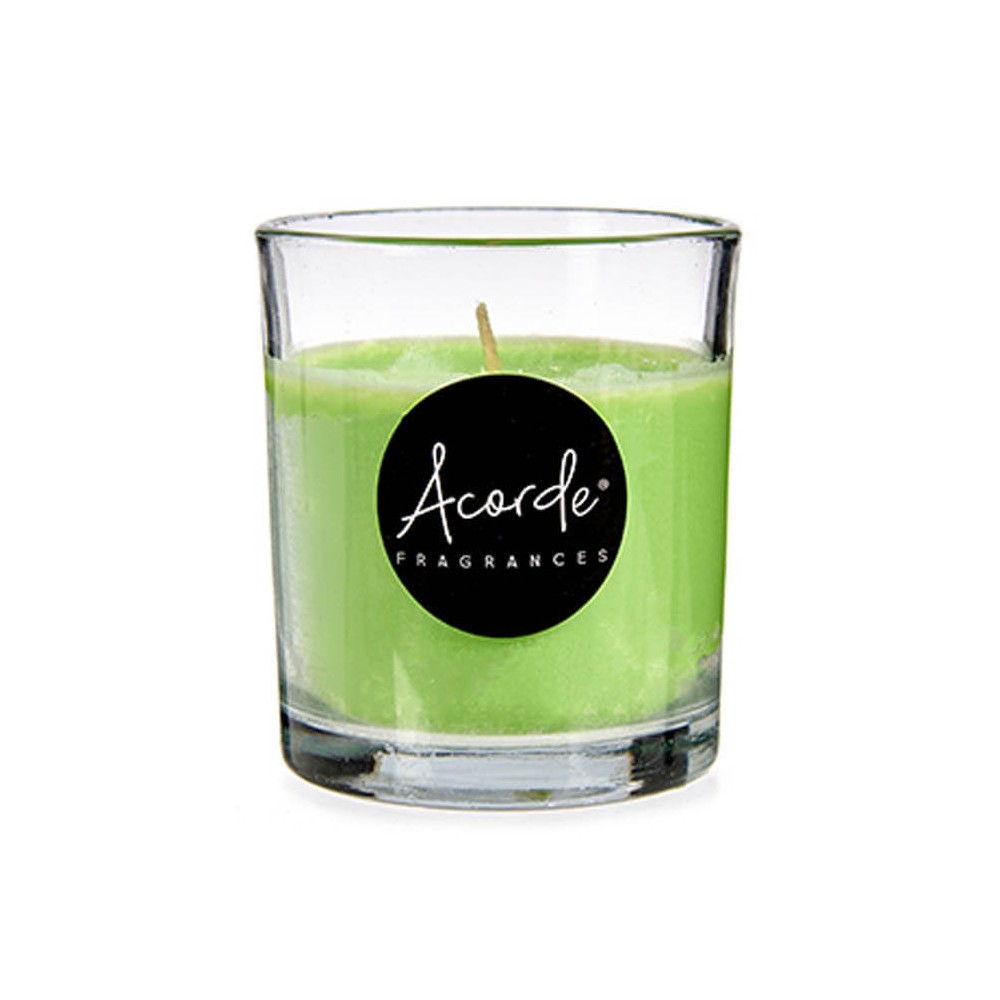 Vela aromática con perfume a Té verde en vaso de cristal transparente.