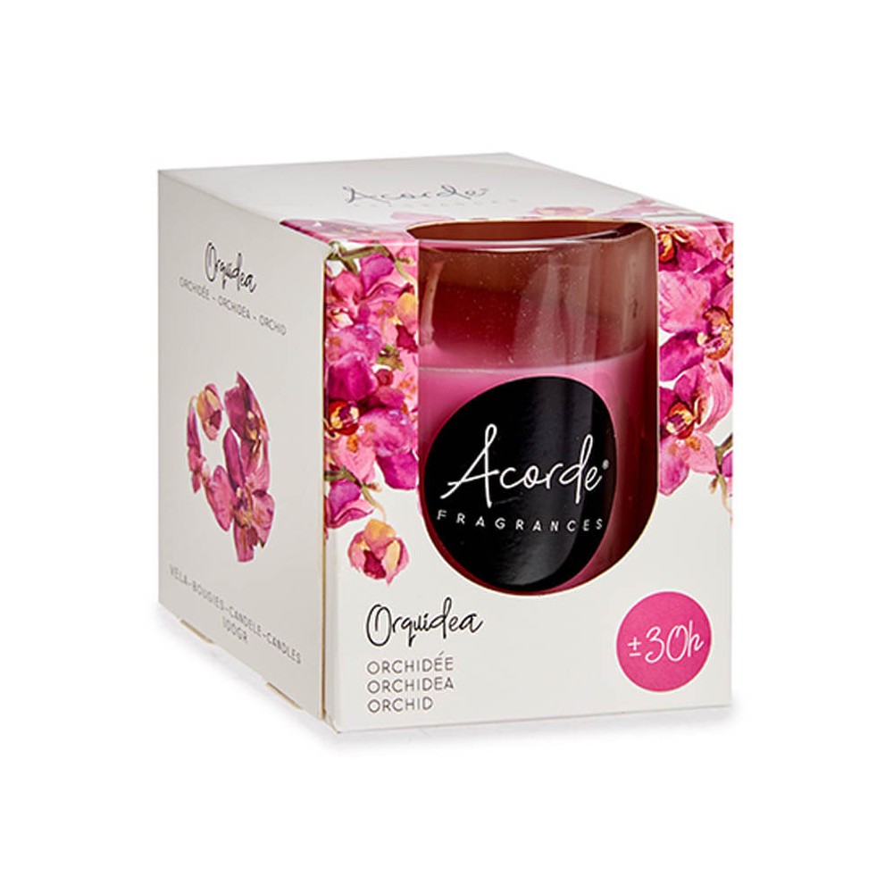Vela aromática con perfume a Orquídea en vaso de cristal transparente.
