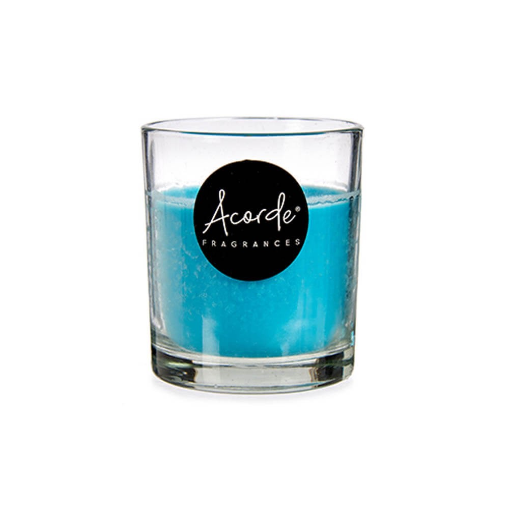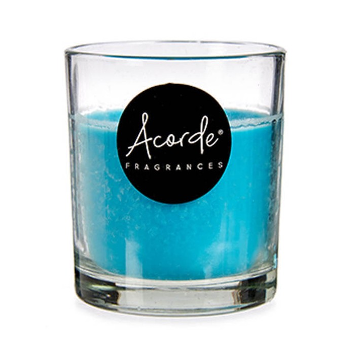 Vela aromática con perfume a Oceano en vaso de cristal transparente.