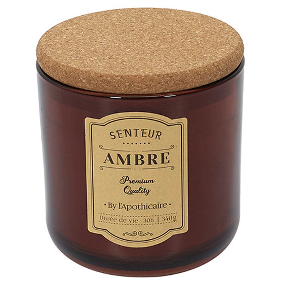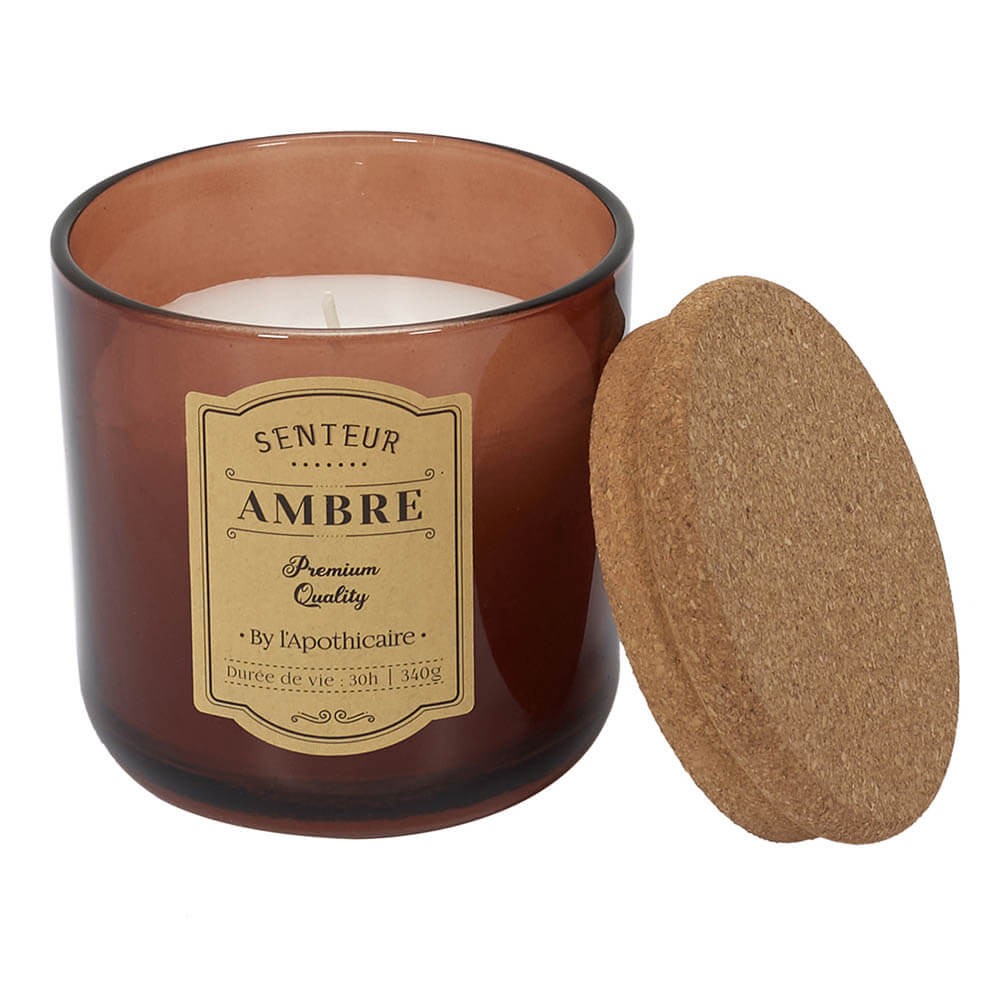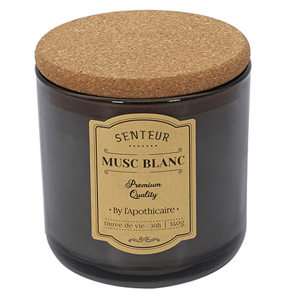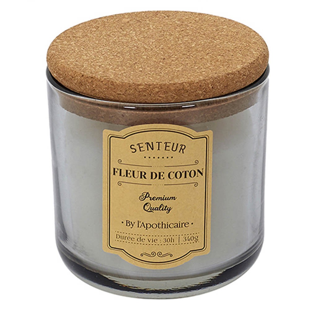 Vela aromática de cera parafina envasada en frasco de cristal de estilo retro con pegatina indicativa, disponible en blanco, marrón o gris con tapa de corcho. Un accesorio ideal para perfumar y decorar las estancias creando un ambiente íntimo y acogedor.