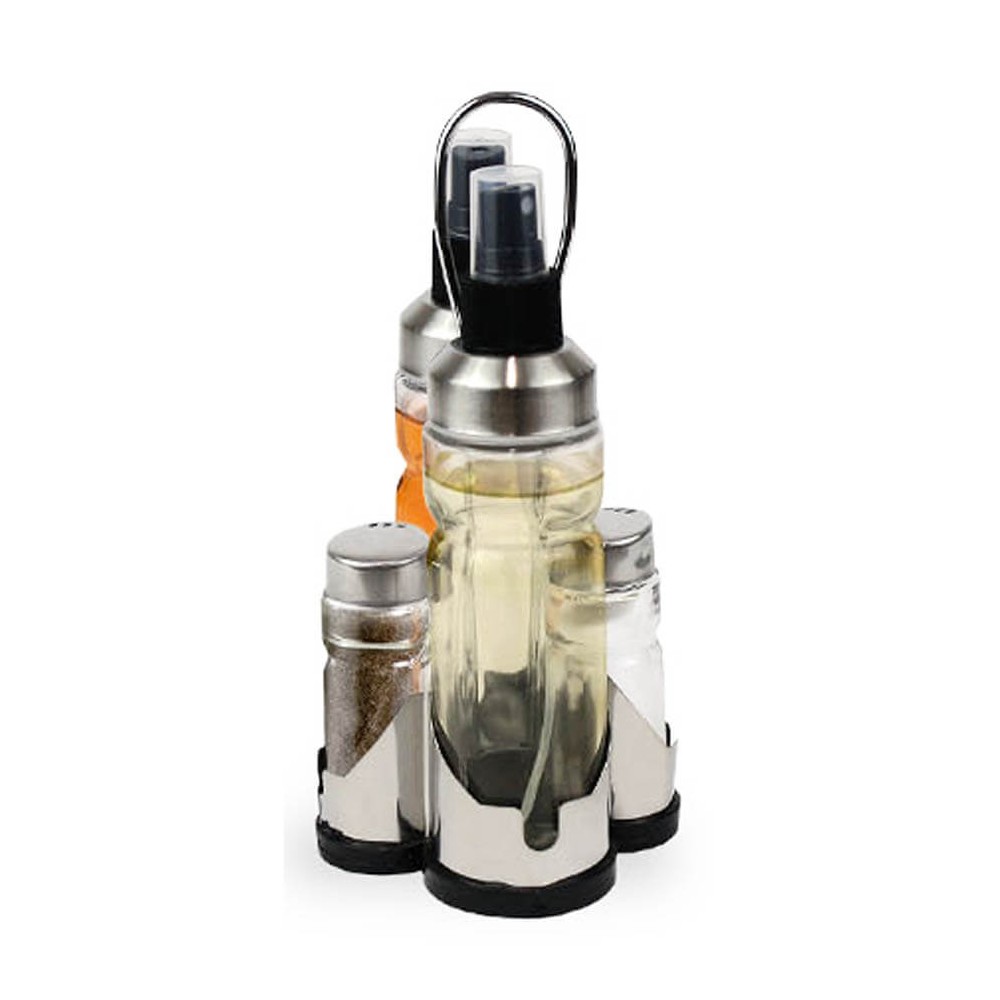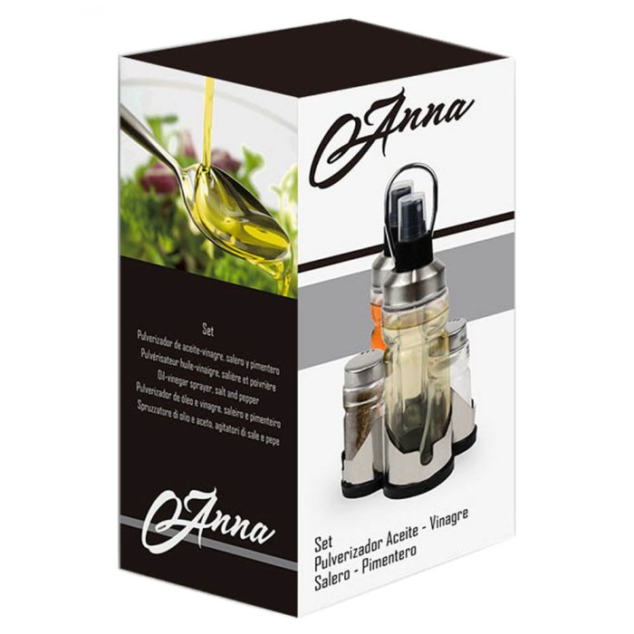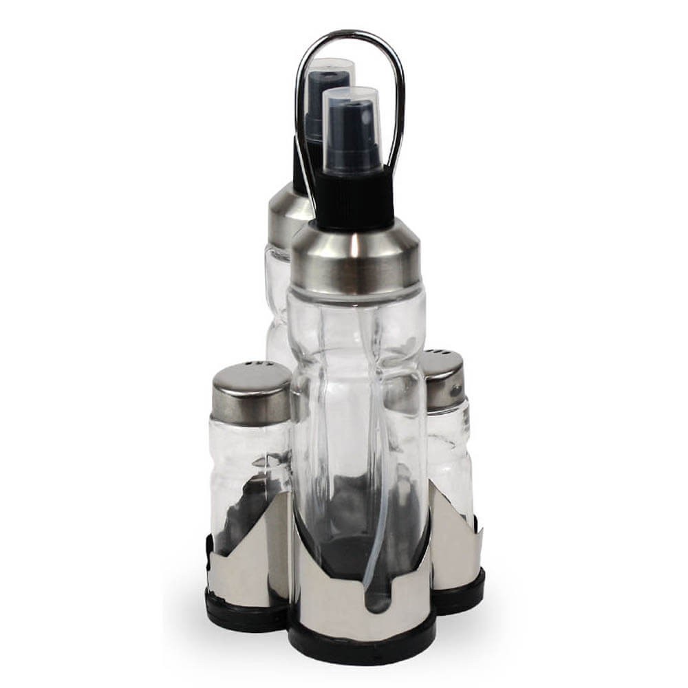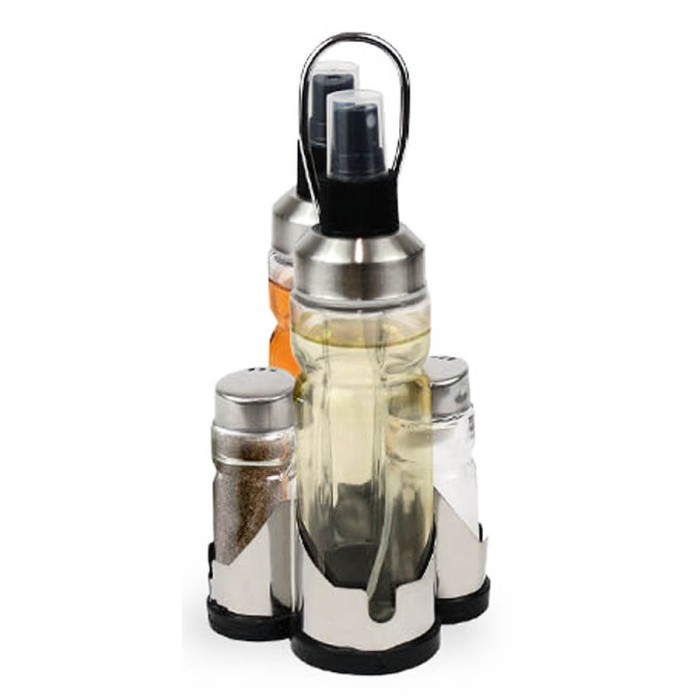 Este convoy incluye todo lo que se necesita para aliñar las comidas, 4 piezas de cristal transparente con tapón metálico, vinagrera, aceitera, salero y pimentero sobre soporte metálico con asa para transportar los recipientes cómodamente.