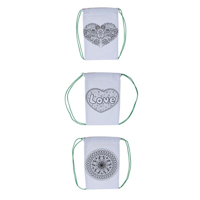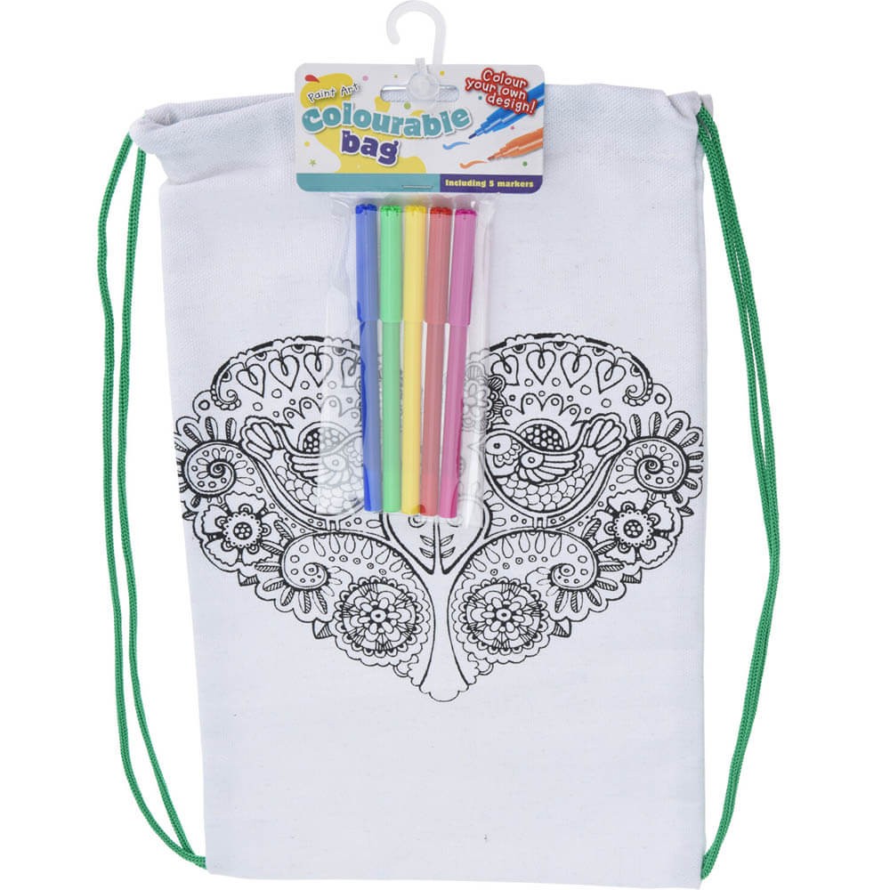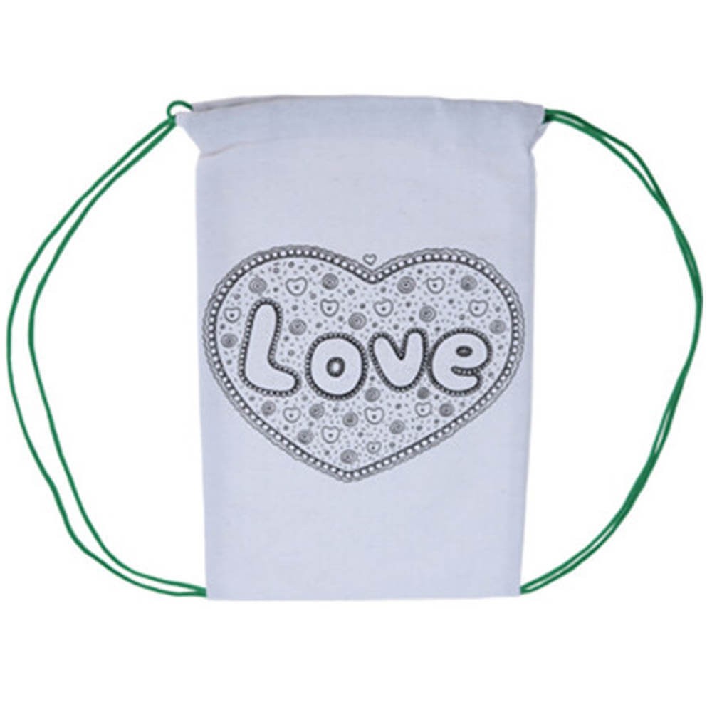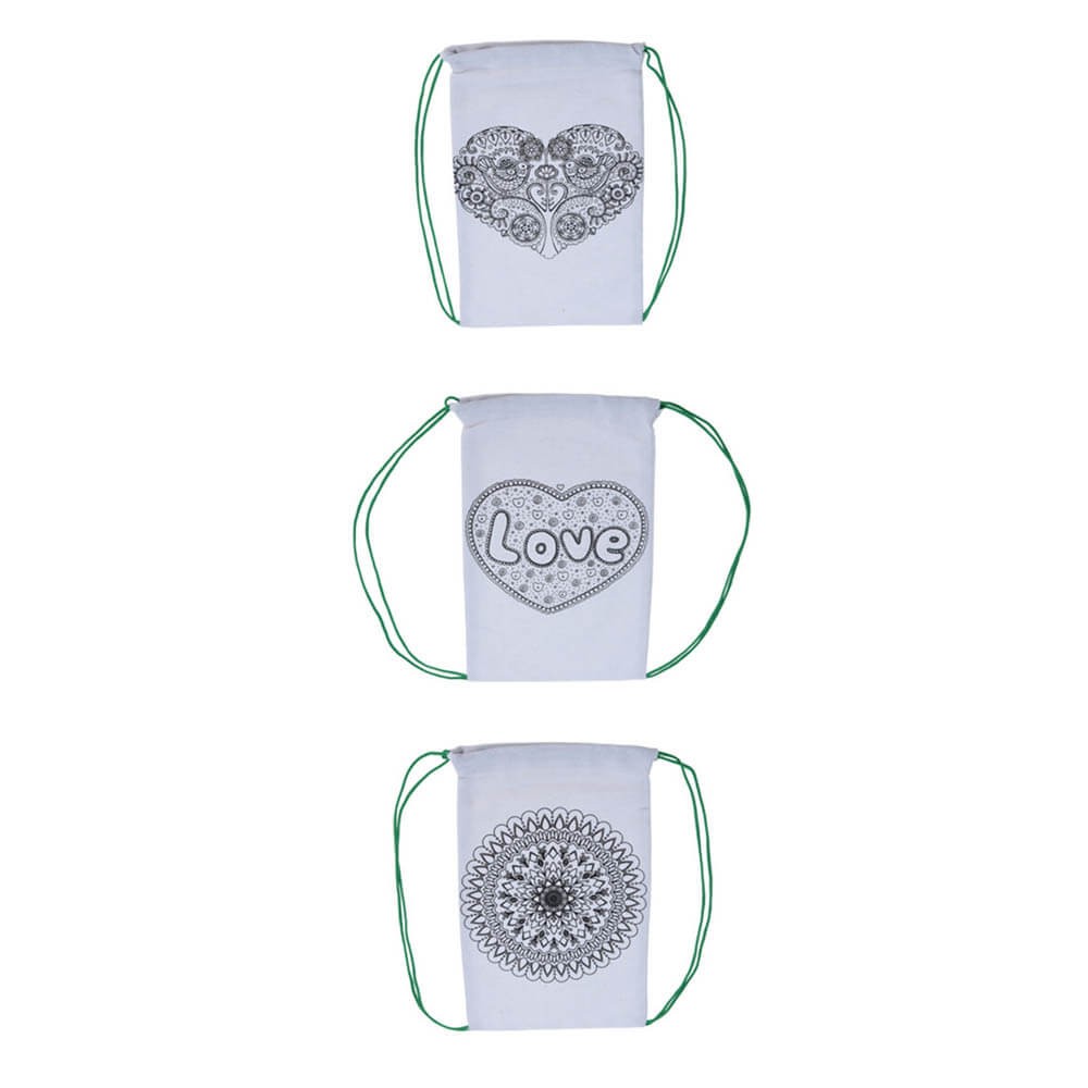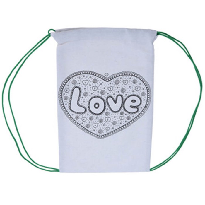 Una bolsa infantil decorada con la silueta de un corazón con dibujos en el interior, un corazón con la palabra love o un mandala, perfecta para que los niños se entretengan pintándola. Incluye 5 bolígrafos de colores.