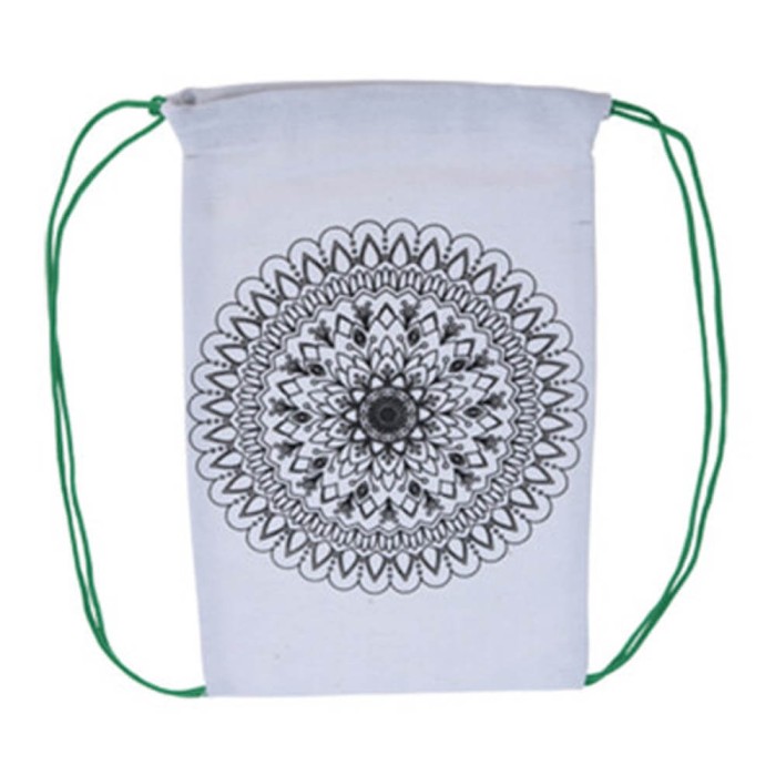 Bolsa confeccionada en tela de poliéster y algodón con cierre de cuerdas. La bolsa tipo saco se cierra mediante unas cuerdas cuando tiras de ellas, estas cuerdas cumplen también la función de asas para poder llevar la bolsa al hombro o tipo mochila en la espalda.