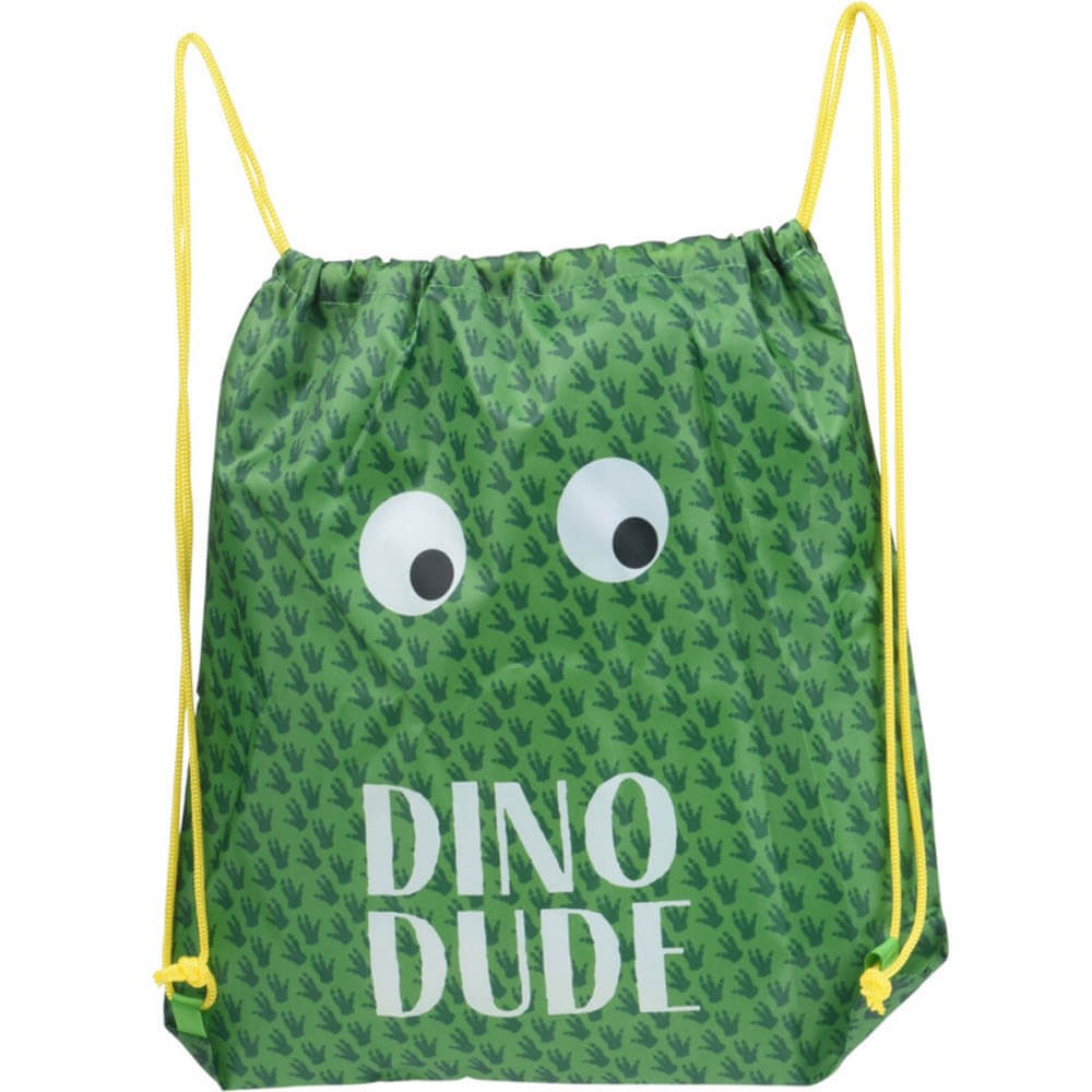 Bolsa diseño dinosaurio confeccionada en tela de poliéster con cierre de cuerdas. La bolsa tipo saco se cierra mediante unas cuerdas cuando tiras de ellas, estas cuerdas cumplen también la función de asas para poder llevar la bolsa al hombro o tipo mochila en la espalda.